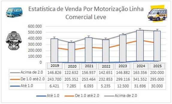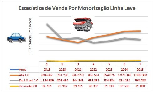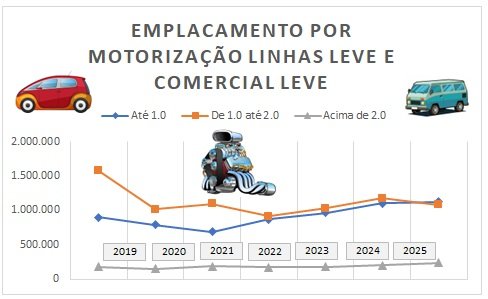 100 mil unidades emplacadas de 2019 a 2025 (este ano previsto) com motores 1.0, outras 1,871 milhão com motor acima de 1.0 e até 2.0, mais 1,079 milhão acima de 2.0, atingindo o acumulado no período de 3,049 milhões de novas unidades em circulação classificadas nesse grupo.