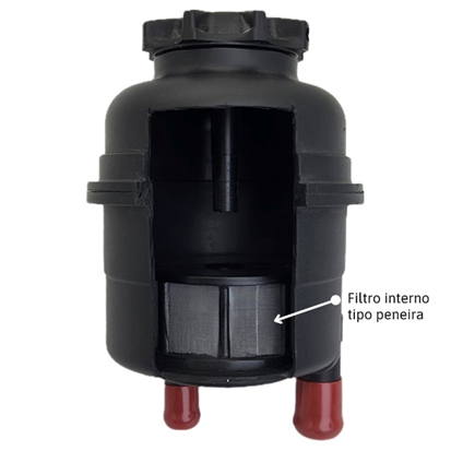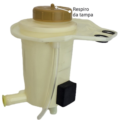 O reservatório armazena o fluído que será utilizado pela direção, assegurando que a bomba receba sempre a quantidade correta de óleo de forma contínua. Também funciona como ponto de retorno, recebendo o fluido que já circulou pela caixa de direção e devolvendo-o em condições de ser reutilizado. Além disso, permite a expansão térmica do fluido, absorvendo as variações de volume causadas pelo aquecimento sem gerar transbordamento no reservatório.