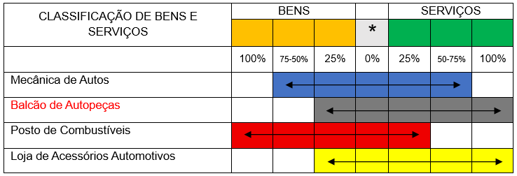 No quadro abaixo é demonstrado uma escala de representatividade entre bens (quando há produtos físicos envolvidos no atendimento) e serviços (quando o atendimento envolve só a mão-de-obra e conhecimento).