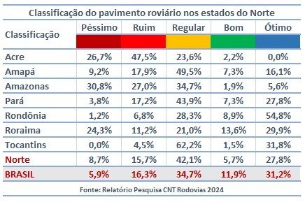 Em 2024, dados sobre o estado das rodovias federais mostravam que o Acre o e Amazonas, não possuíam estradas classificadas como ótimo. Atualmente o Amazonas está com apenas 7,5% das suas estradas classificadas como “bom ou ótimo” enquanto no Acre esse índice é de apenas 2,2%. A média Brasil é de 43,1% na soma das duas classificações.