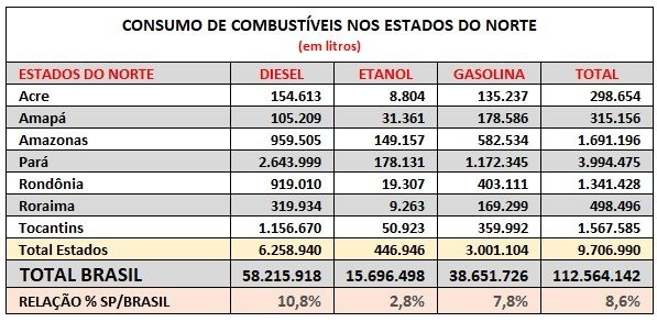 É alto o consumo de diesel no norte do país, como já comentado anteriormente. Essa relação acima dos demais combustíveis é que explica o índice de demanda da linha diesel ser maior na região norte, proporcionalmente a outras regiões do país.