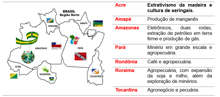No Norte a importância dos negócios originados no setor primário da economia é representativa, sobretudo com as atividades agrícolas, com a pecuária e a pesca sendo destaque nos três estados. O extrativismo mineral e vegetal (madeiras) é igualmente considerado muito importante na formação do PIB de cada estado.