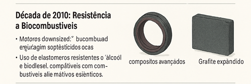 • Vedações começaram a usar fluoro elastômeros (FKM/Viton), suportando temperaturas mais altas e contato com combustíveis agressivos