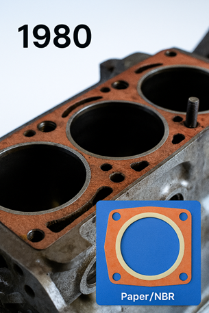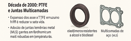 1980: Borracha NBR e juntas de papel — soluções simples, baixo custo, mas pouca resistência térmica/química.