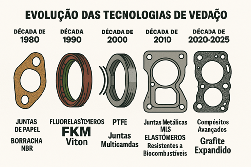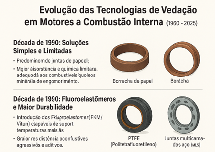 Entre 1980 e 2025, os motores a combustão interna passaram por grandes avanços em materiais e tecnologias de vedação. As vedações evoluíram de borrachas convencionais para compostos avançados como fluoro elastômeros, PTFE e materiais híbridos, capazes de resistir a maiores temperaturas, pressões e agentes químicos, acompanhando a busca por maior eficiência, durabilidade e redução de emissões.