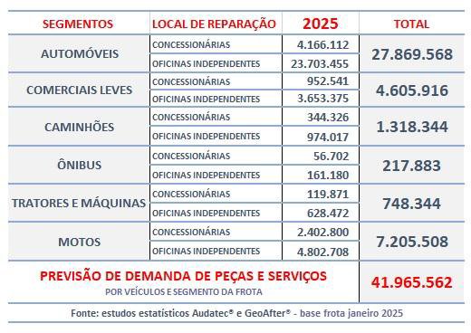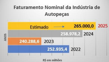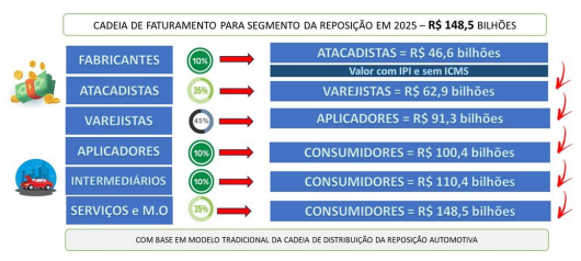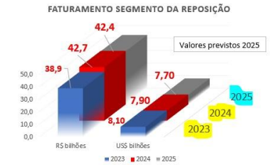O quadro abaixo expressa os números com base em acompanhamento das tendências. Em 2025 o faturamento total do segmento de reposição deve atingir R$ 42,4 bilhões, das fábricas para os demais componentes da cadeia de distribuição foi de aproximadamente R$ 116,3 bilhões só em peças, não incluindo pneus, acessórios e óleo ou combustível, equivalente a uma redução de -0,7% em relação a 2024.
