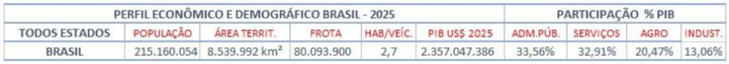 O PIB (Produto Interno Bruto) em 2025 deverá atingir o valor de US$ 2,357 trilhões (contra US$ 2,18 trilhões em 2024) mantendo o Brasil como a 10ª maior economia do mundo, segundo o FMI (Fundo Monetário Internacional) e a Austin Rating.