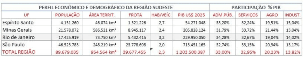 Região com maior concentração de demanda do país, a região Sudeste deverá registrar o menor crescimento do PIB entre as demais. Estima-se que seja entre 1,8 e 2,0%. Essa desaceleração será creditada à política restritiva de crédito e juros altos, alta de custos de produzir, queda de otimismo da população. O setor de serviços, que é o principal ponto da atividade econômica regional, não deverá superar o número de 1,5% de crescimento. O agronegócio deverá ser a surpresa favorável na região, especialmente por resultados de São Paulo. Em resumo, a economia do Sudeste em 2025 deve crescer de forma constante, mas aquém da média nacional e do dinamismo de outras regiões.
