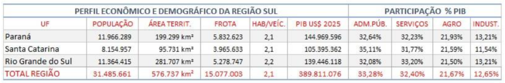 A economia da região Sul do Brasil em 2025 apresenta um cenário de crescimento acima da média nacional, embora com desafios notáveis, especialmente no Rio Grande do Sul, e com o agronegócio sendo o principal motor econômico. O Paraná teve o maior crescimento econômico do Brasil nos primeiros cinco meses de 2025. O Rio Grande do Sul apresentou uma queda no PIB e, apesar disso, os esforços de reconstrução no estado contribuíram para que instituições como o IBGE e o FMI melhorassem ligeiramente a projeção de crescimento do Brasil como um todo para 2,4% em 2025. A economia de Santa Catarina deve continuar em crescimento, com uma projeção de expansão próxima de 5,0%, superando a média nacional. O dinamismo do estado é impulsionado por setores como indústria, serviços e o agronegócio, com programas do governo contribuindo para o avanço.