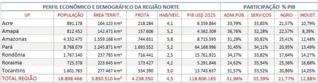 A economia do Norte em 2025 projeta um crescimento moderado, impulsionado pelo setor de serviços e indústria extrativa, com destaque para o Pará, que deve ser o terceiro estado com maior crescimento do país. A agropecuária tem papel importante, mas a previsão é de um desempenho mais modesto, com possível queda na produção de carne bovina. O crescimento do PIB na região em 2025 deve ficar na média de 3,5%, impulsionada principalmente por efeitos da COP30 realizada em Belém.