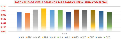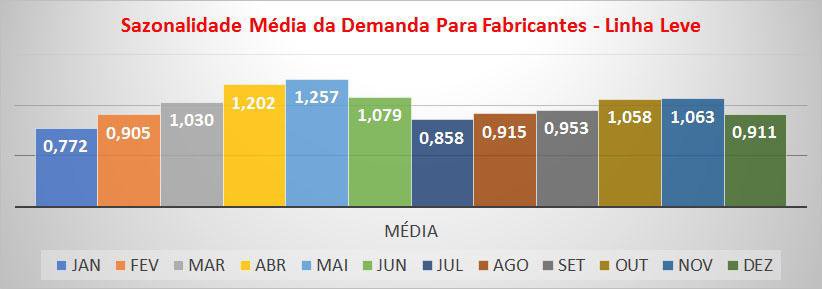 Com base em pesquisas realizadas pela GeoAfter® sobre resultados de faturamento mensal em amostra de 11 fábricas de autopeças, sendo 3 da linha suspensão, 3 da linha de peças para motor, 2 de freios (leve e pneumático), 1 de peça elétrica e 2 de acessórios, a sazonalidade média observada está expressa nos gráficos abaixo.