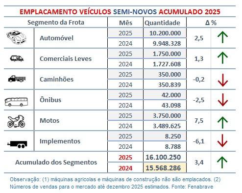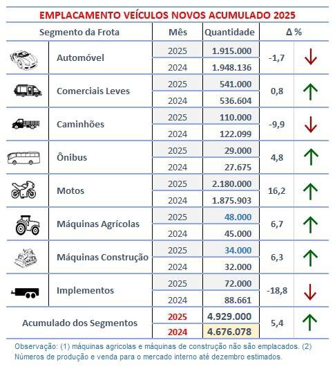 O mercado de venda de veículos novos esteve em alta em 2025, evoluindo 5,4% em relação ao ano de 2024, considerando-se todos os segmentos, o que inclui máquinas agrícolas e rodoviárias, além de implementos rodoviários.