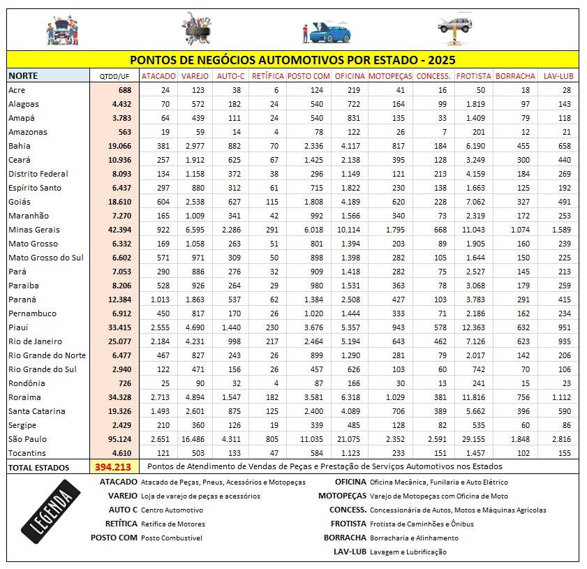 No Brasil, em 2025, são estimados haver em operação regular perto de 394,2 mil pontos de negócios automotivos, parte deles prestadores de serviços, outra parte apenas negociantes de autopeças.