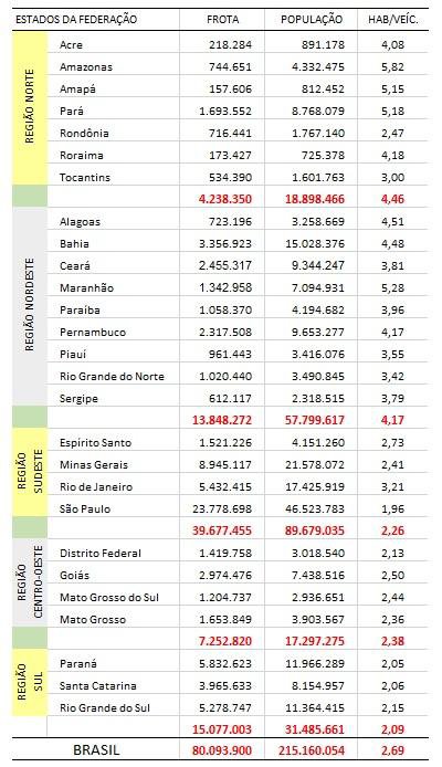 A frota brasileira de veículos automotores em circulação está atingindo 80 milhões de unidades (entre todos os segmentos), o que faz o país atingir 2,7 habitantes por veículo, já que temos 215 milhões de habitantes (segundo última divulgação do IBGE). Neste caso, consideramos todos os segmentos, incluindo motos. Como comparativo, atualmente os EUA possuem 2,2 habitantes por veículo (incluindo apenas carros, comerciais leves e caminhões).