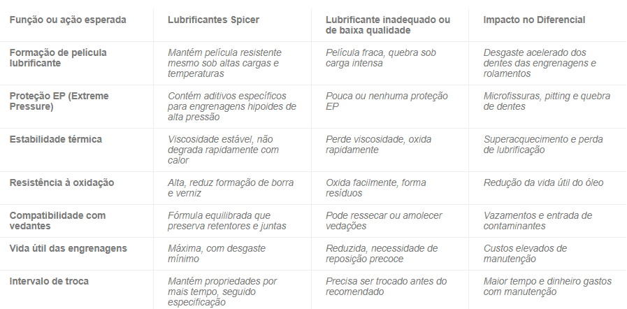 Confira as vantagens dos Lubrificantes Spicer, na tabela: