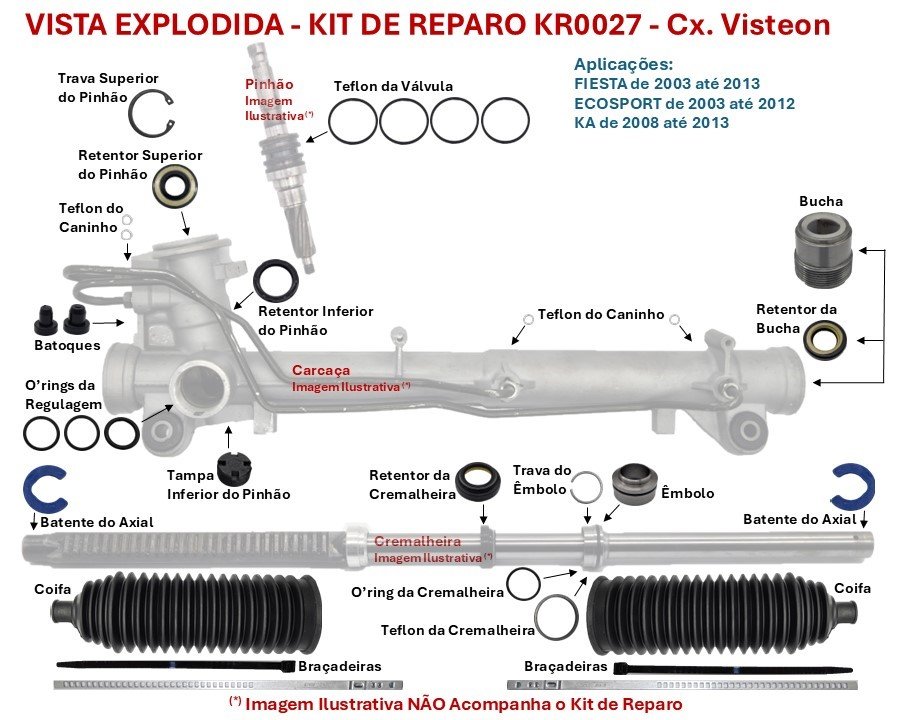 Os modelos Ford Fiesta, EcoSport e Ka utilizam caixas de direção hidráulica originais Ford, fabricadas pelas marcas TRW e Visteon, ambas identificadas pelo logotipo Ford em relevo na carcaça.