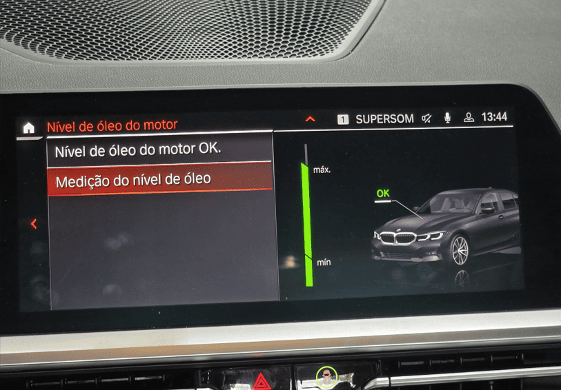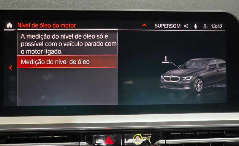 Ao selecionar, nível de óleo do motor, a imagem é de uma vareta de nível virtual. Pois a BMW há algum tempo, desde 2008, não utiliza vareta de óleo física.