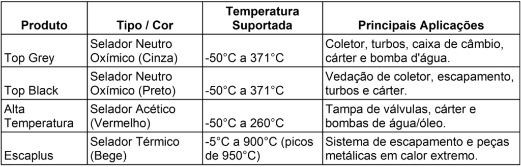 O catálogo possui quatro opções específicas para diferentes necessidades térmicas no elevador. Esse selante suporta o calor extremo de até 900°C nos modernos sistemas de escapamento. A marca disponibiliza bisnagas que variam de 70g até 315g/280ml. A inovação eleva o padrão de qualidade do serviço de vedação nas garagens brasileiras.