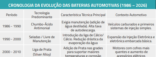 1. A Quebra de Paradigma (2010): Note que até 2010, a evolução focava em durabilidade e “conforto” (não precisar pôr água). A partir de 2010, com a tecnologia EFB, a bateria passou a ser parte do sistema de redução de emissões do veículo.
