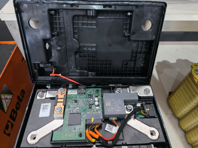 Ao remover a tampa de fechamento, temos a visão do circuito eletrônico, bem como a placa de controle, chamada de BMS: