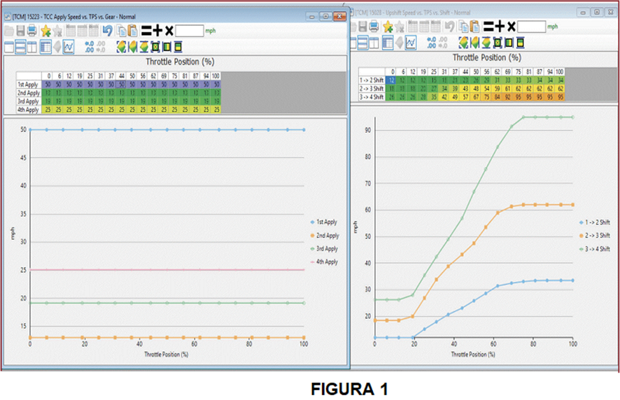 Serviços de dados como Alldata, Mitchell1, Identifix e sites de serviço de fabricantes de equipamentos originais (OEM), fornecem as especificações necessárias. A Figura 1 mostra uma programação típica de trocas de marcha do HP Tuners para uma transmissão 6L50 (1ª a 4ª marchas). Isso demonstra o comportamento esperado pelo módulo de controle do motor (PCM). Qualquer desvio significativo do comportamento esperado indica uma falha, ou seja, algo dentro da transmissão não está respondendo conforme o esperado.